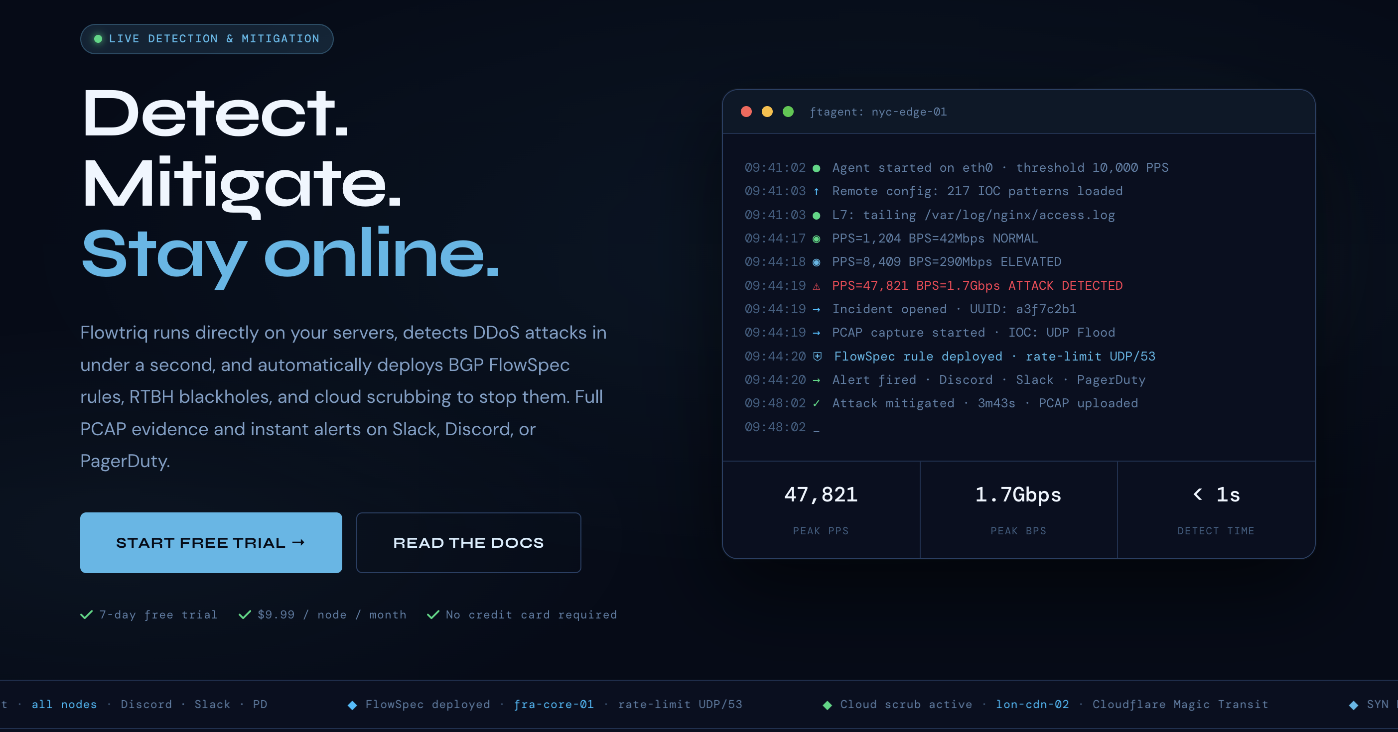 Flowtriq shifts the ROI calculus by moving the intelligence to the edge. By installing a lightweight Python agent directly on your Linux nodes, you gain packet-level visibility without the overhead of heavy infrastructure. This is particularly vital for bootstrapped founders who need to protect varied workloads—from game servers to fintech APIs—without incurring the "traffic surcharges" that make scaling a nightmare. When you can mitigate an attack before it even hits your upstream’s threshold, you aren't just saving your servers; you’re protecting your LTV (Lifetime Value) by ensuring a seamless user experience during the exact moments your competitors are failing. This isn't just a security tool; it’s an insurance policy against reputation-killing downtime.